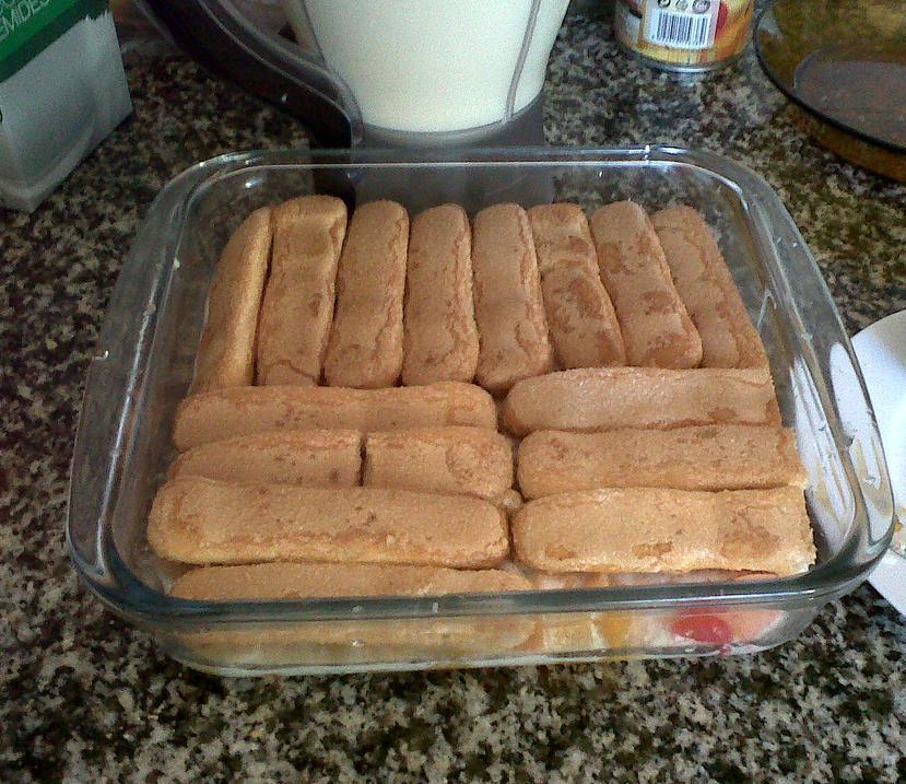 Neste a este ponto você deverá começar a montar o seu tiramisu sem ovo: pegue uma travessa ou recipiente fundo e cubra-o com bolachas champanhe, também conhecidas por outros nomes, empape as bolachas com o café que você tinha reservado. Recomendamos-lhe que use uma pequena jarra ou molheira que permita controlar a quantidade de café que joga sobre as bolachas ou que use um prato, que te permita ir rodando a bolacha no café.