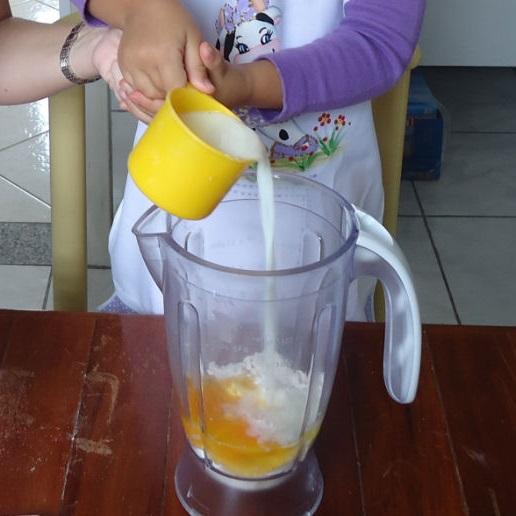 Comece por colocar no liquidificador os ingredientes líquidos, incluindo os ovos que deverão ter sido previamente batidos.