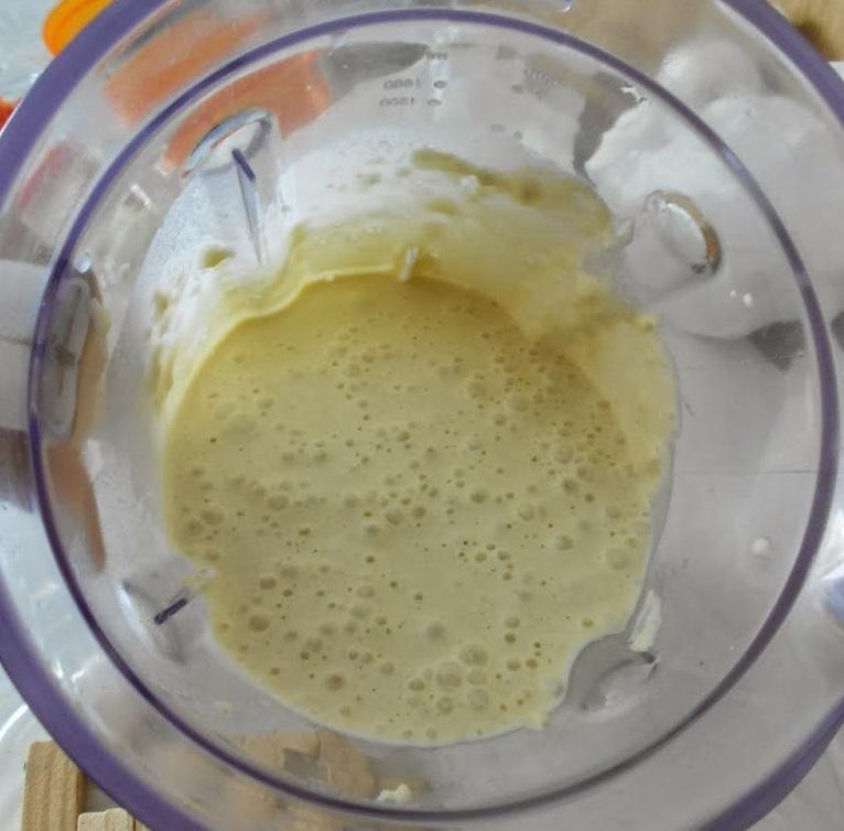 Adicione os restantes ingredientes e ligue a máquina para liquidificar tudo. A consistência deverá ser cremosa e ligeiramente líquida.