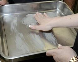 Unte uma forma com margarina e farinha de trigo. Despeje nela metade da mistura feita no liquidificador.