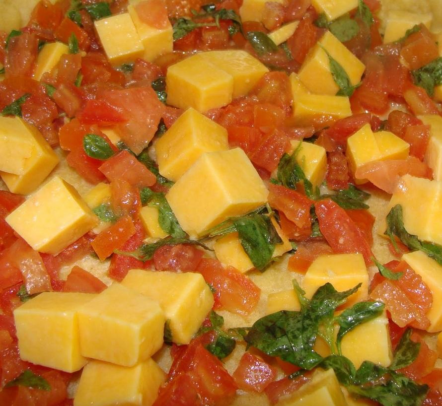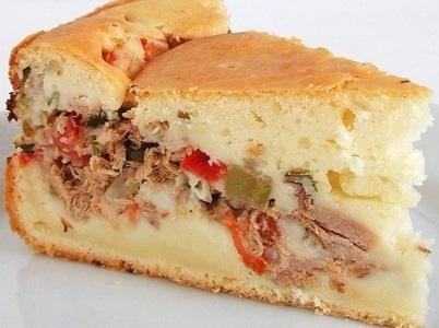 Recheie a torta com ingredientes à sua escolha que podem variar entre legumes, frango, queijo, fiambre, azeitonas e outros.