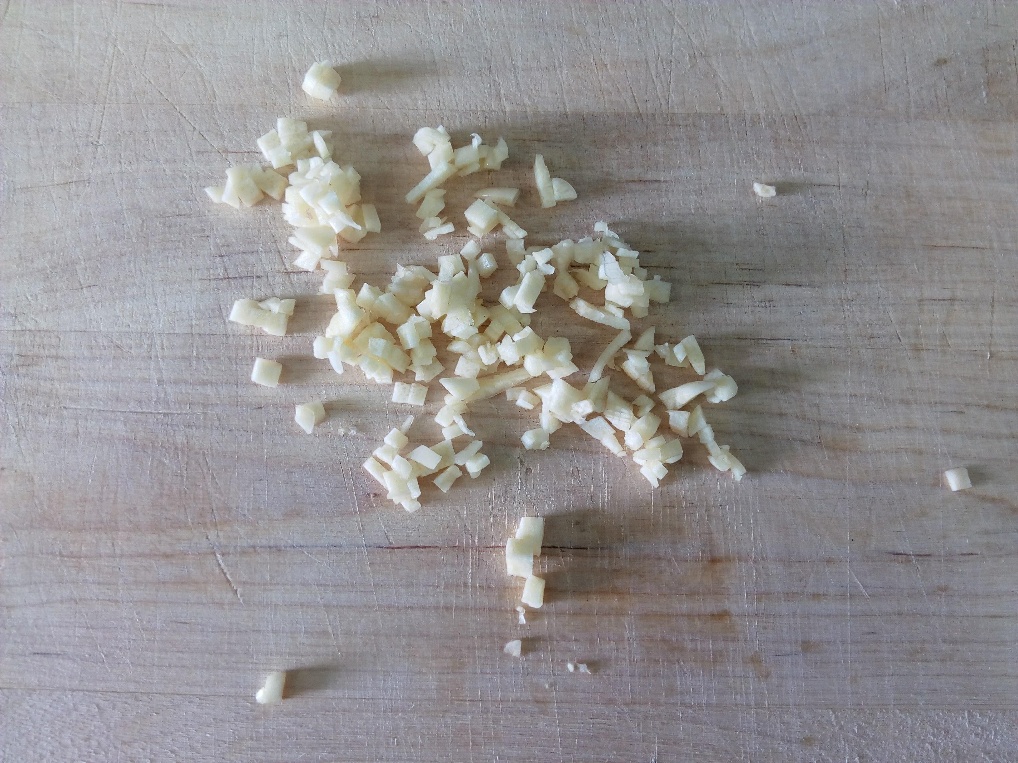 Em seguida, pique um dente de alho finamente. Aqueça as duas colheres de sopa de óleo em uma panela e refogue o alho picadinho.