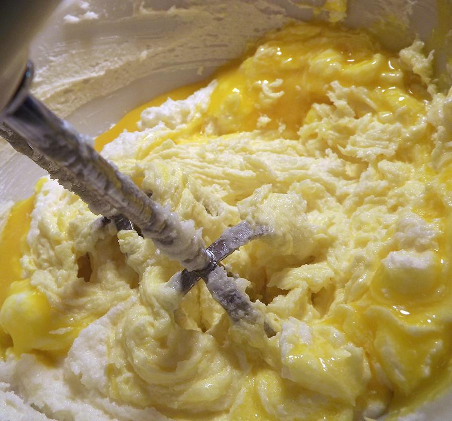 Quando a manteiga estiver batida, adicione as gemas uma a uma e continue batendo. Quando estiverem bem integradas, adicione o açúcar pouco a pouco. É muito importante que não deixe de bater bem todos os ingredientes para que eles se misturem. Reserve a mistura para mais tarde.