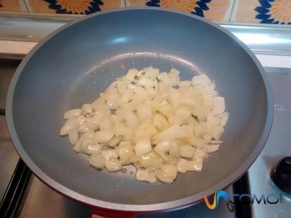 Coloque para esquentar uma frigideira com azeite de oliva e quando estiver bem quente, acrescente o alho e a cebola para murchá-los. Será necessário manter o fogo baixo para que não queimar estes vegetais e cozinhar corretamente.
