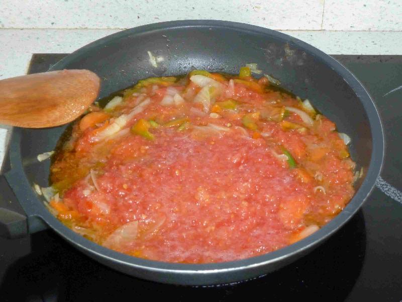 O seguinte passo será adicionar o tomate ao refogado, de maneira que pode optar entre tomates naturais maduros, que primeiro deverá ter descascado, ou utilizar a massa de tomate comprada. A segunda opção será apropriada para aquelas ocasiões nas quais não temos tempo suficiente para descascar os tomates e esperar que cozinhem.