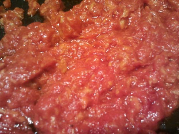 Se optarmos por usar tomates naturais maduros para fazer o refogado do espaguete, será necessário tirar a pele e cortá-los, mas se preferirmos o tomate triturado do supermercado, pouparemos este passo. Uma vez que a cebola esteja bem cozida, acrescentaremos à frigideira o tomate em pedaços ou já triturado; pode aumentar um pouco o fogo, mas volte depois a abaixá-lo para evitar que se queime o refogado.