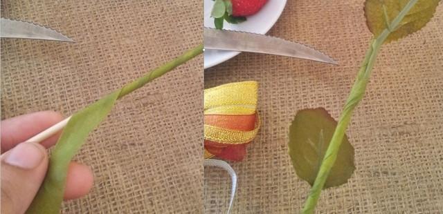 Para fazer uma flor com morangos deve começar com o talo. Envolva os palitos com fita floral para simular um talo real, insira as folhas das rosas artificiais e enrole-as com fita floral também, deste modo conseguirá um resultado mais perfeito.