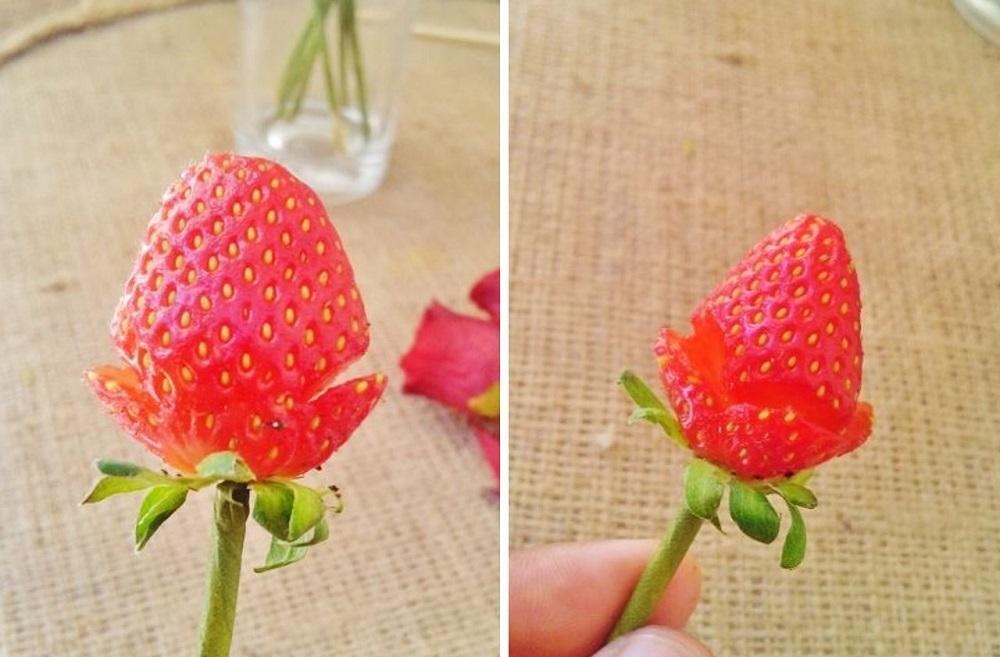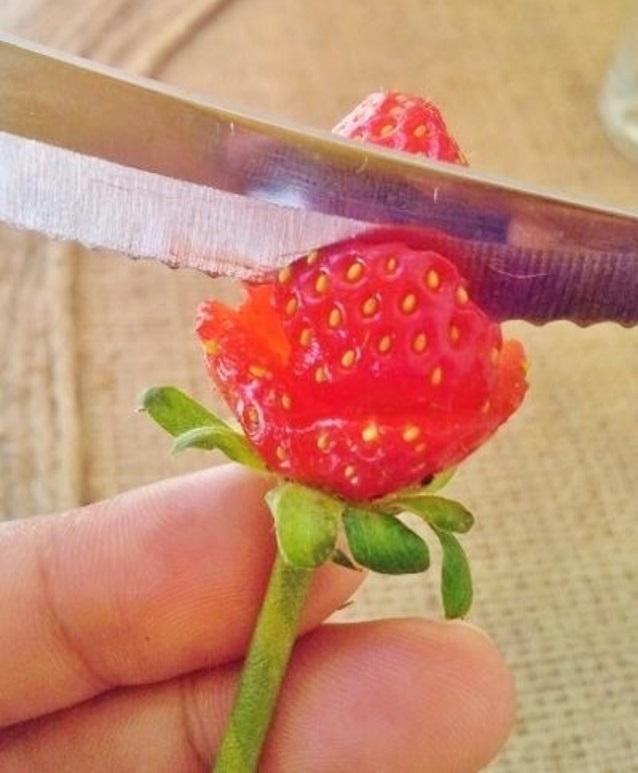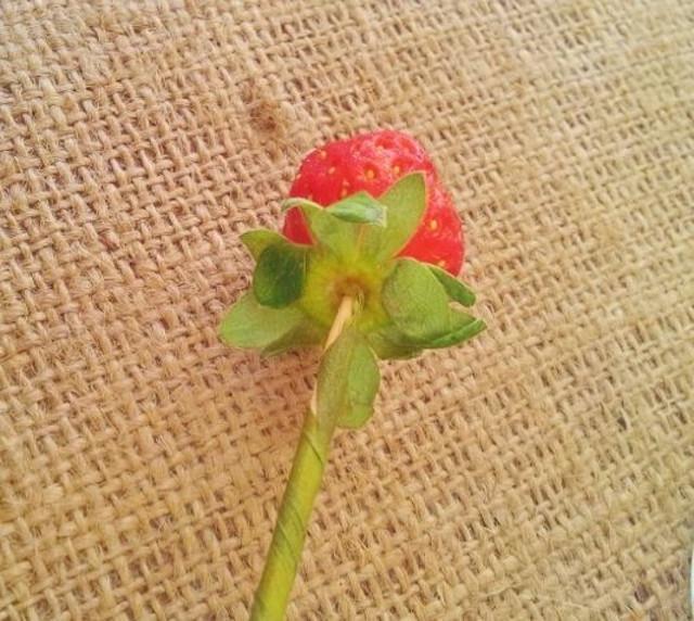 Retire os caules dos morangos que usará para sua elaboração e utilize a ponta dos palitos para espetar com suavidade os morangos e prendê-los adequadamente aos palitos. Agora já terá o morango colocado no talo artificial desta deliciosa flor.