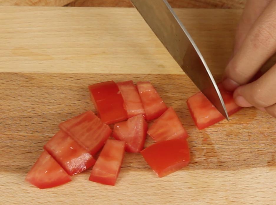 O primeiro passo é lavar bem os tomates, retirar as sementes e cortar em cubinhos pequenos. Lave também o pimento verde, retire as sementes e corte-o em cubos. Pique a cebola em pedaços pequenos e o cheiro verde.