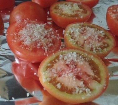 O segundo passo é forrar uma bandeja para o forno com papel de alumínio, em cima colocar os tomates cortados ao meio, de boca para cima, com bastante sal em cima. Você pode ver melhor na imagem anexa a este passo. Um ponto muito importante é pôr um pouco de azeite em cima da lâmina de papel de alumínio para que os tomates não grudem.