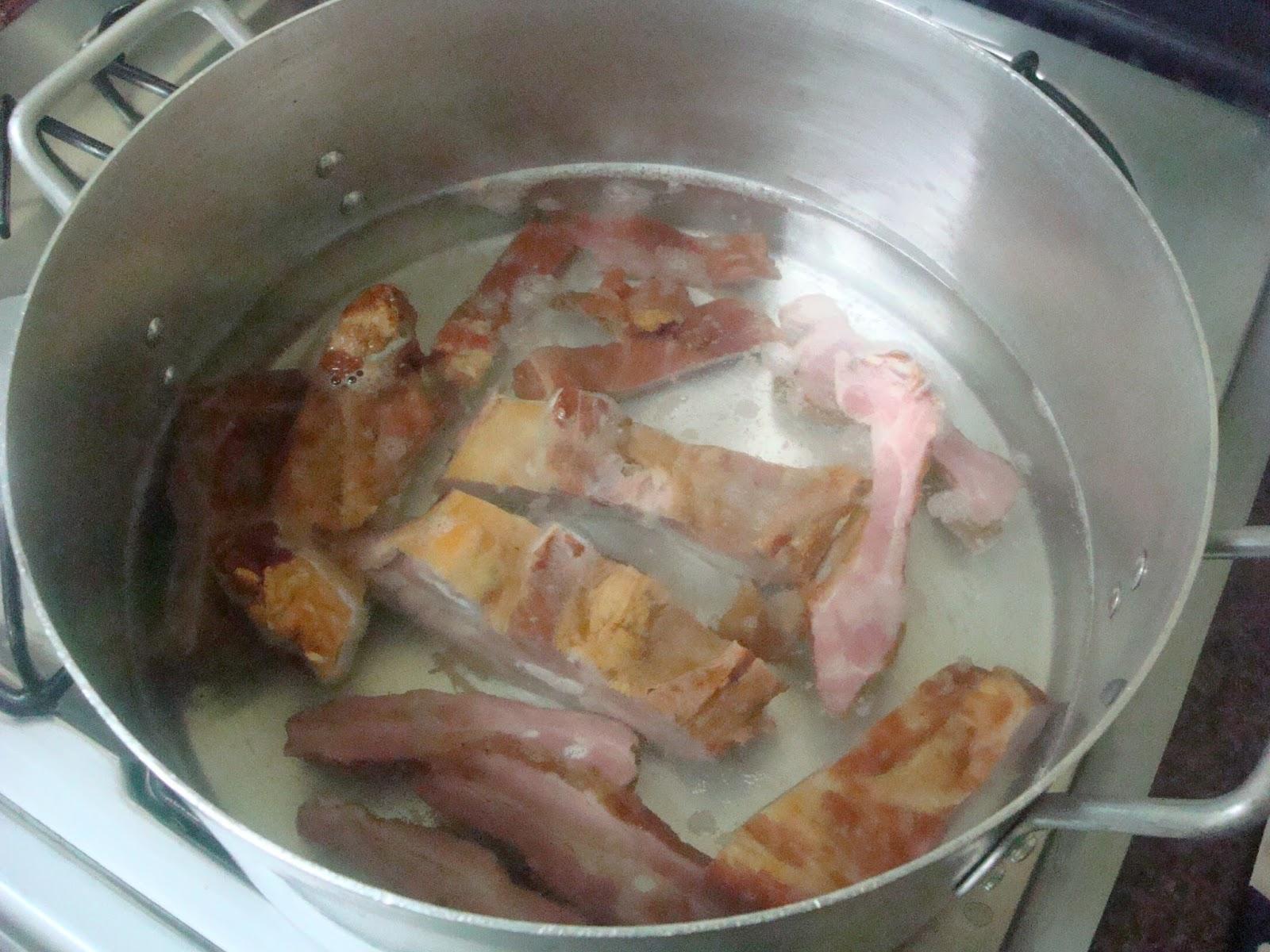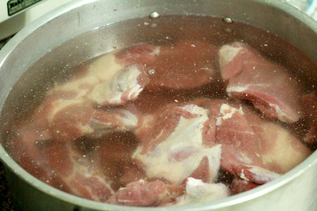 Depois de demolhar as várias carnes (no dia seguinte), coloque-as para ferver em água limpa por cerca de 25 minutos para remover o excesso de gordura. Descarte a água e reserve a carne.